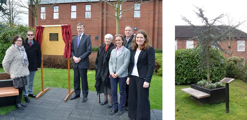 Above: Sue's family with former Cranfield University Vice-Chancellor, Sir Peter Gregson; the memorial tree.